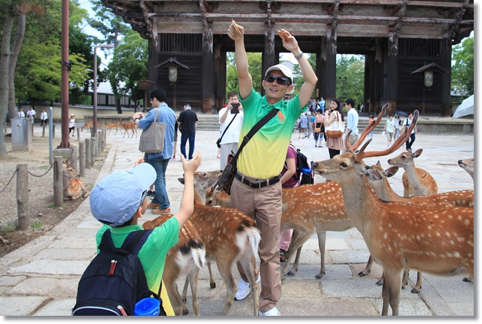 我們全家一起去奈良的目的是餵鹿,我看到很多人都被鹿追。到了鹿非常多的時候,爸爸就買仙貝給我們餵鹿,姐姐最膽小了看到鹿就把仙貝分給鹿。而我卻超勇敢,讓鹿一直追,媽媽邊拍照邊笑。